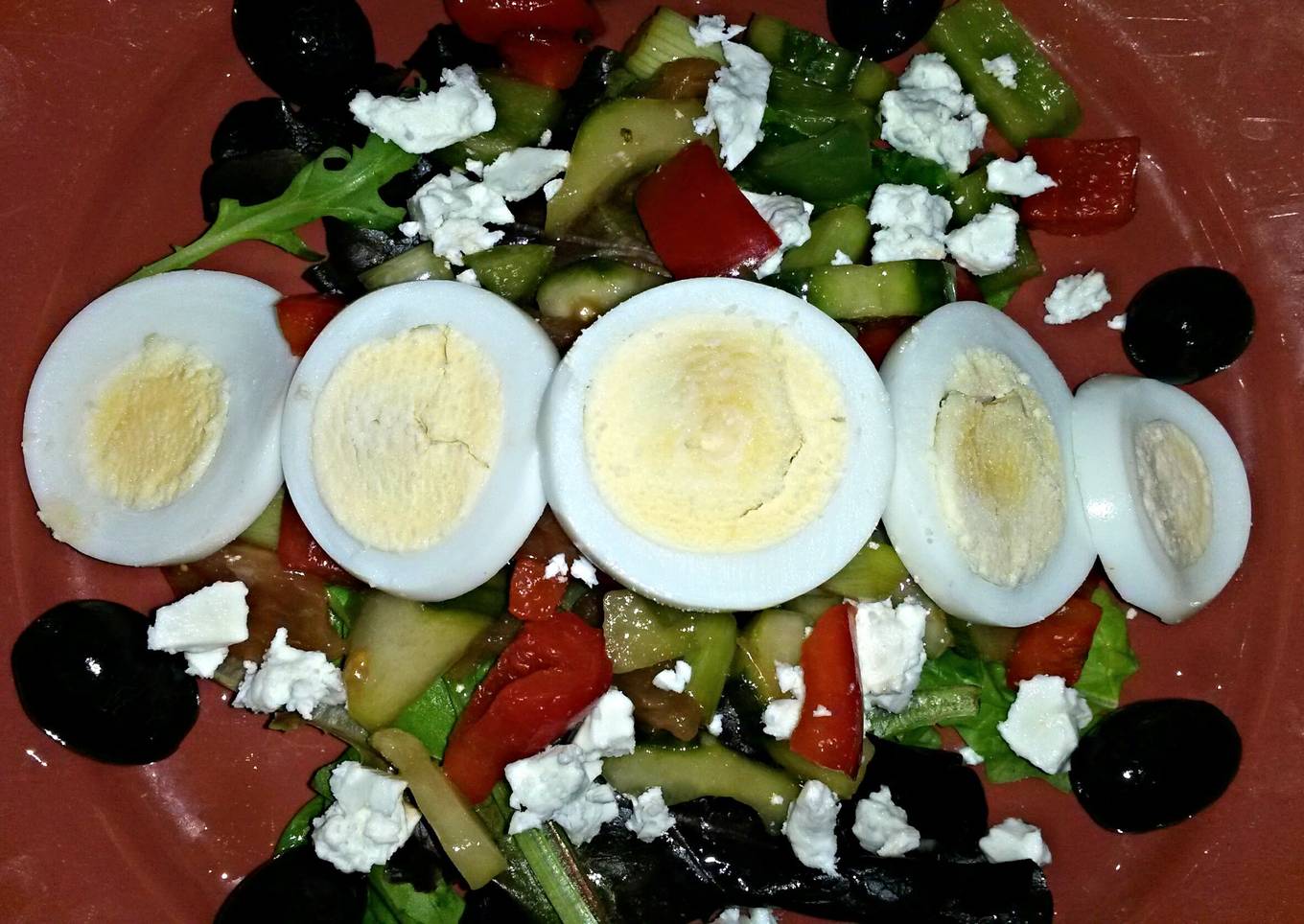 - Arrange the salad in a bowl with the eggs and the olives on top or over the side.